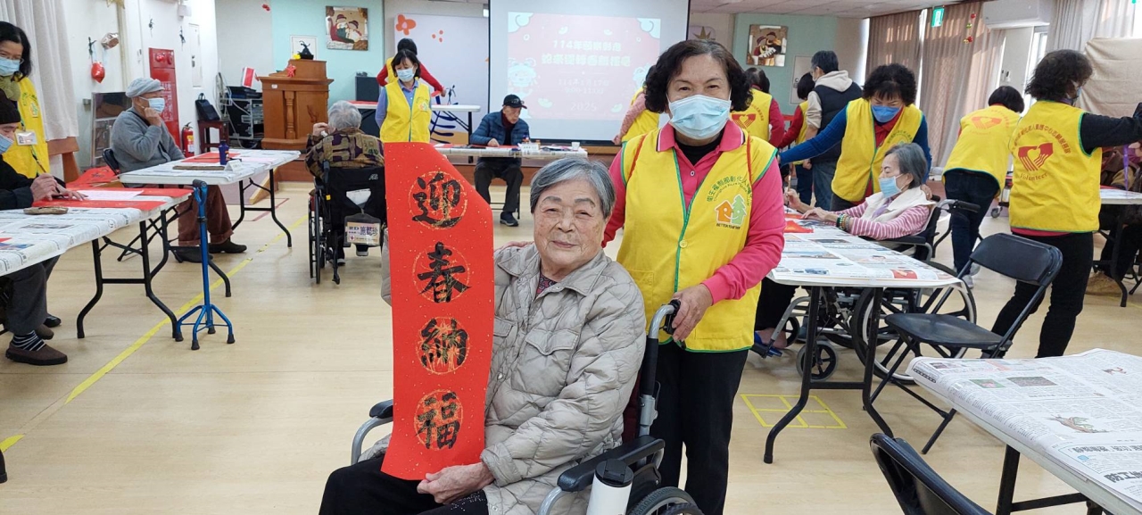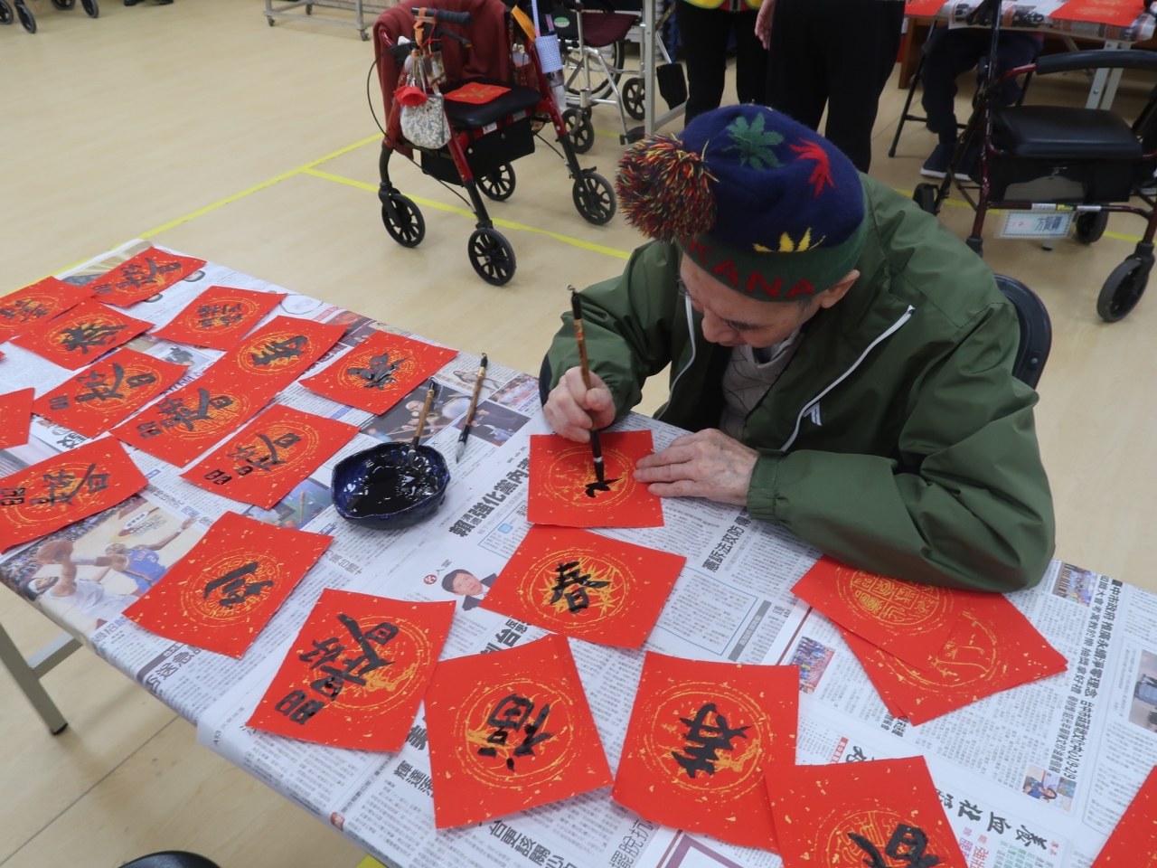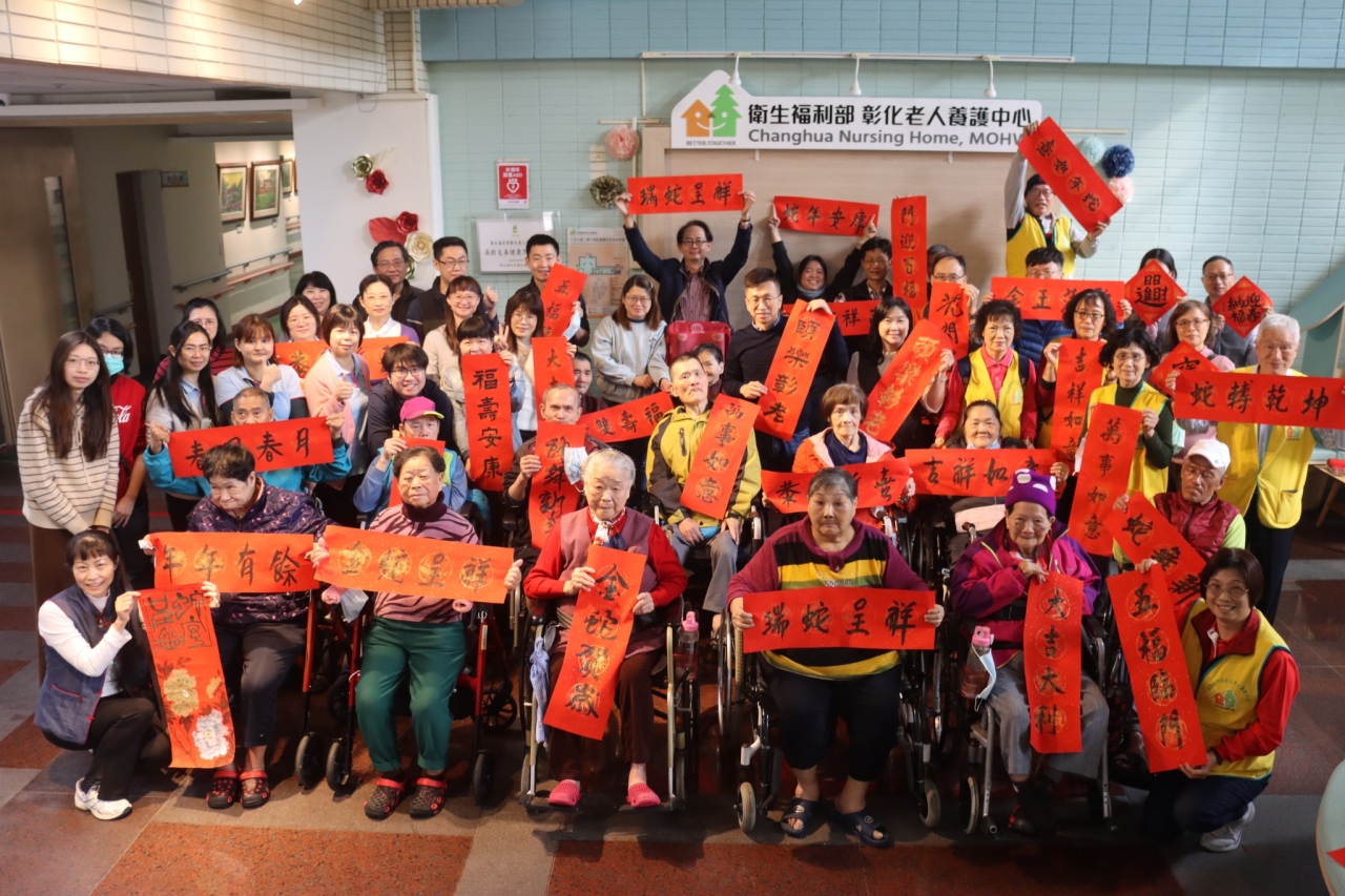 114年1月17日中心在農曆年前辦理了蛇來運轉春聯揮毫活動,邀請弘道書法學會榮譽理事長詹坤艋老師外,也邀約好鄰居--退輔會中彰榮家的爺爺奶奶,與中心平常較少有機會動筆的阿公阿嬤們拿起毛筆共同寫下對新一年的期許與祝福。 揮毫後長輩們也帶著春聯與中心同仁及志工,一起拍下賀年團照祝福大家新年快樂,院長也循往例迎佳節添新彩更換春聯,期望蛇年裡中心長輩們皆能福壽安康。