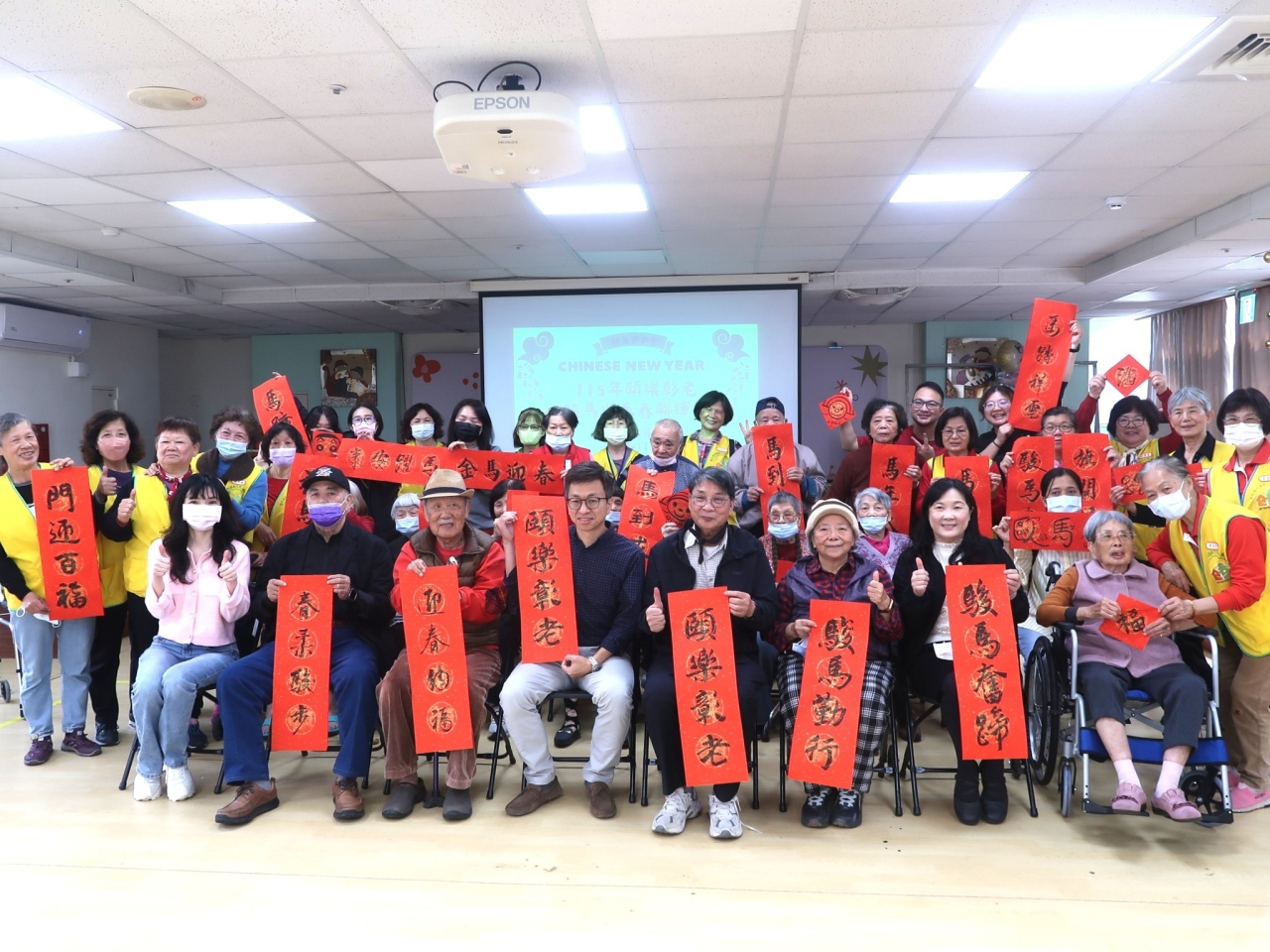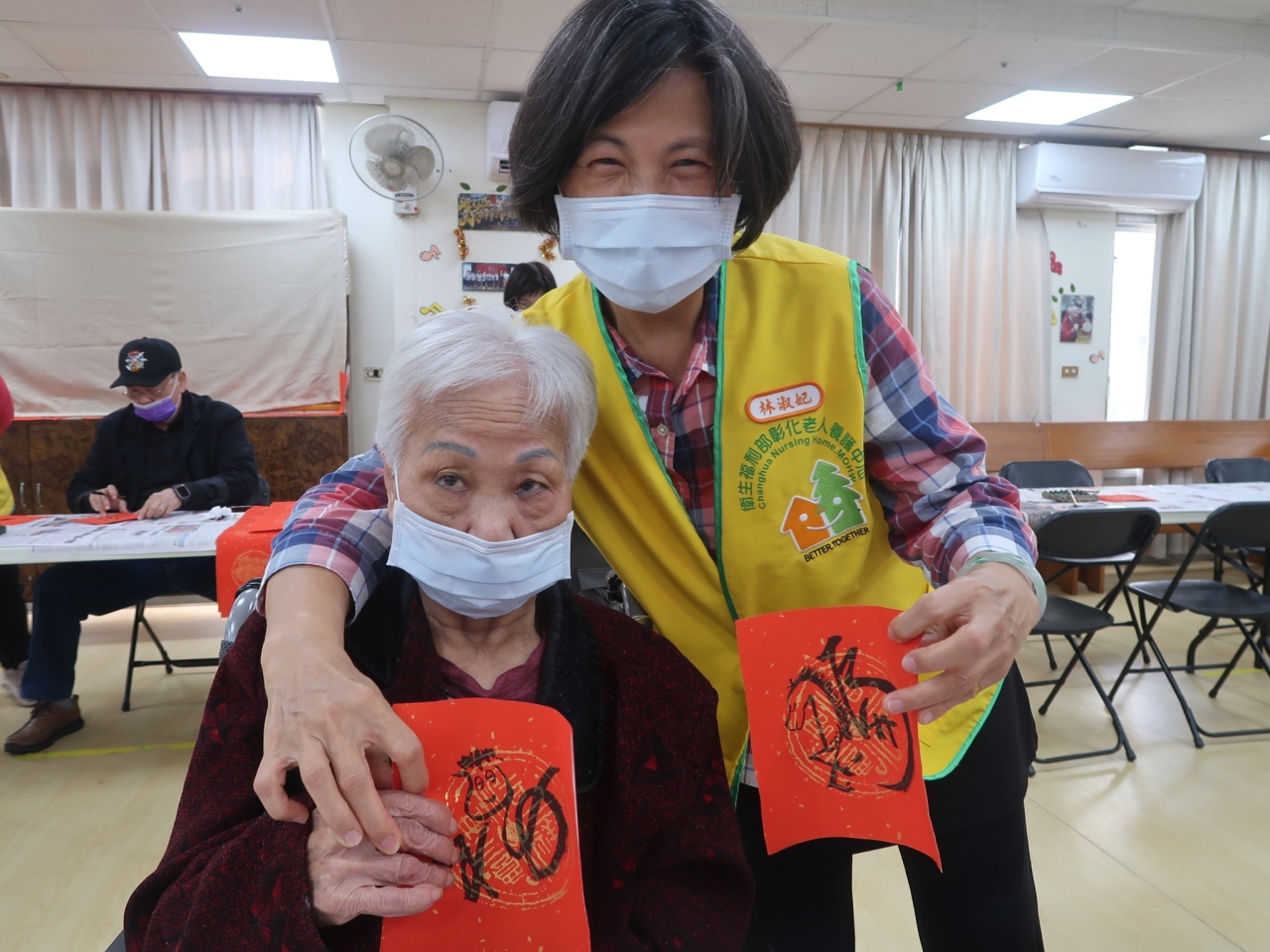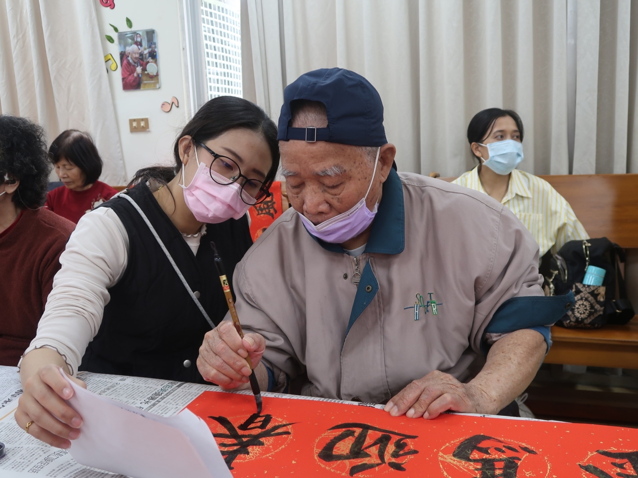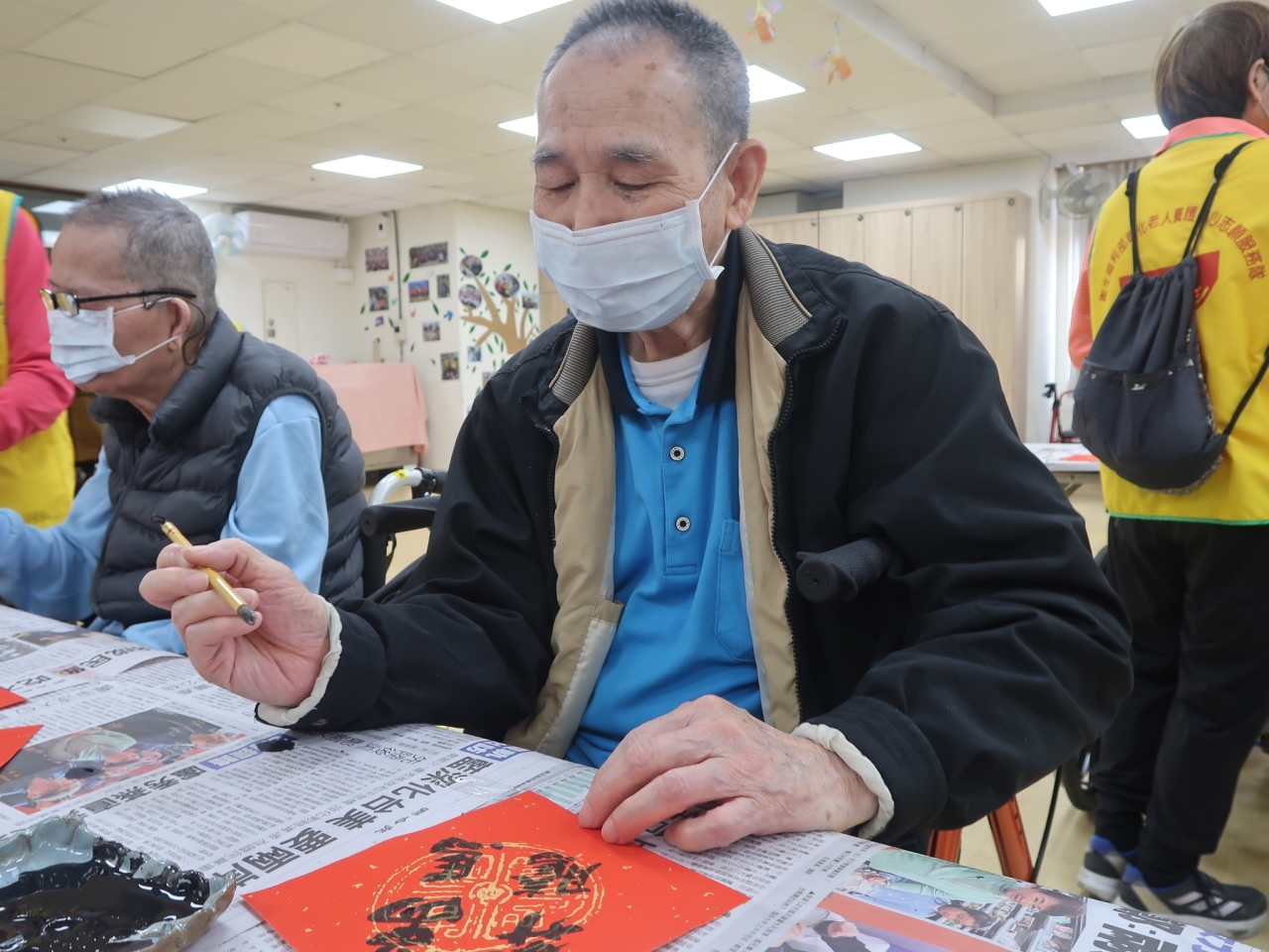 活動過程也鼓勵中心長輩拿筆寫下對於新一年度的期許與祝福,阿公阿嬤會先露出靦腆的笑容說:「我不會寫字啦,手會抖寫得不好看啦!」然而在工作人員及志工的引導下一筆一畫的落筆,寫出屬於自己獨一無二的春聯並開心的展現給旁人看,讓充滿紅紙及黑墨的活動現場洋溢著濃濃的年味。